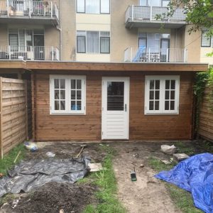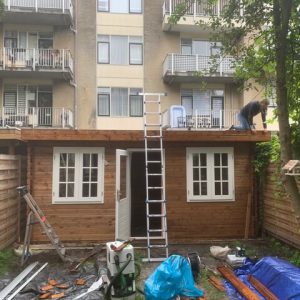 Plaatsen van een houten tuinhuis met geisoleerd dak en epdm-dakbedekking.
